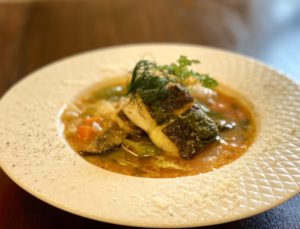 皮目をパリパリに仕上げた目鯛をあったかいスープ仕立てで。