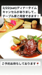 2/22(sat)団体様ご予約のキャンセルがありましてテーブル席4席ご用意できます。