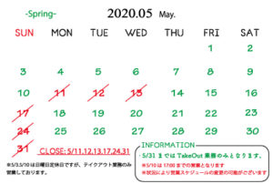 5/31までテイクアウトのみでの対応とさせて頂きます。
