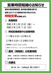 1/15〜2/7までの期間を営業時間短縮として営業いたします。