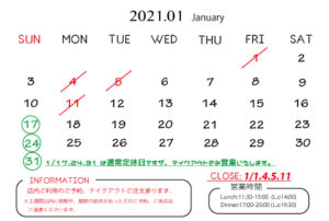 2021.01の定休日変更のお知らせ