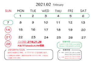 ちょっと遅くなりましたが、2月の営業スケジュールをお伝えします。