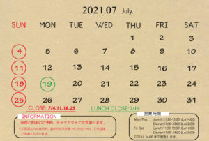 日曜定休 11:30〜15:00(L.o.14:00) 17:00~0:00(L.o.23:00)