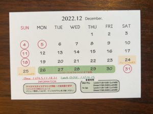*クリスマスディナー準備の為ランチタイムのみお休みです*