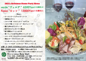 ご家庭での家族賑やかなクリスマスパーティーやお二人でワインと共に愉しんでいただけるテイクアウトメニューです